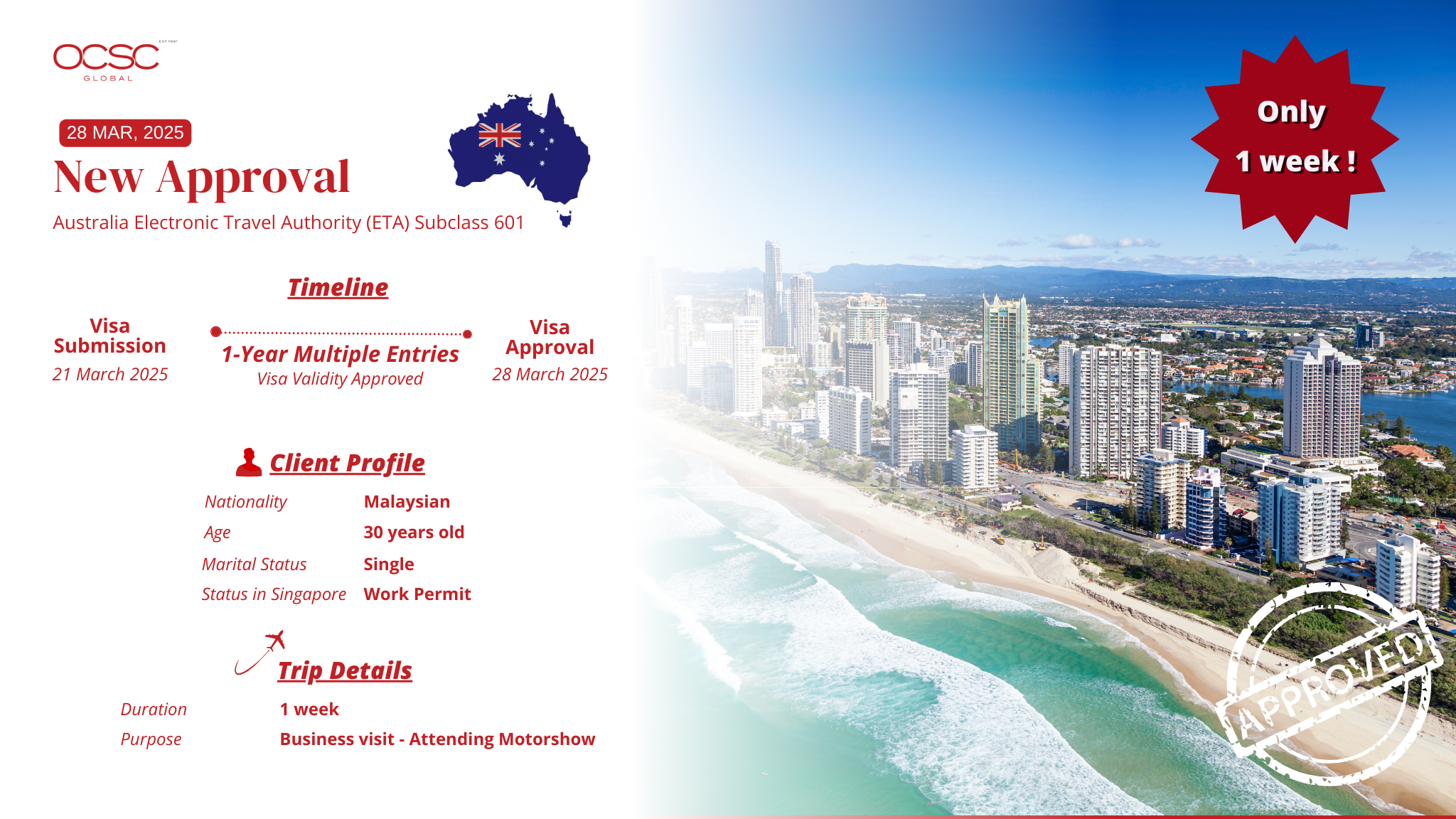 Securing a visa for business travel shouldn’t be complicated, and with the Australia Electronic Travel Authority (ETA) Subclass 601, it’s even more convenient. We’re pleased to share that Alan, a Malaysian national working in Singapore, successfully obtained his ETA visa to attend a motorshow in Australia—with approval granted in just one day after submitting additional documents!
