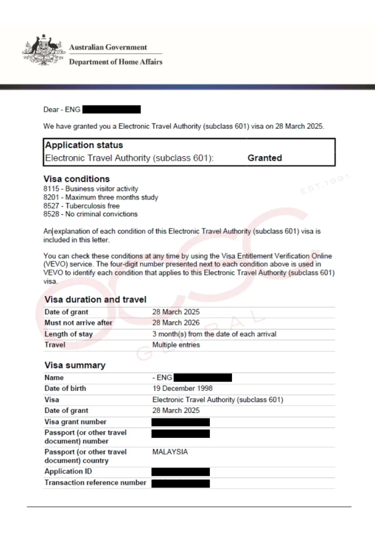 Traveling to Australia for business is now easier than ever! We’re pleased to share that Eng, a Malaysian professional based in Singapore, successfully secured his Electronic Travel Authority (ETA) Subclass 601 Visa for an upcoming business trip. With a fast approval process, he can now travel with confidence.