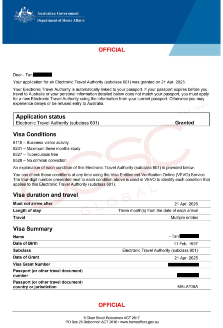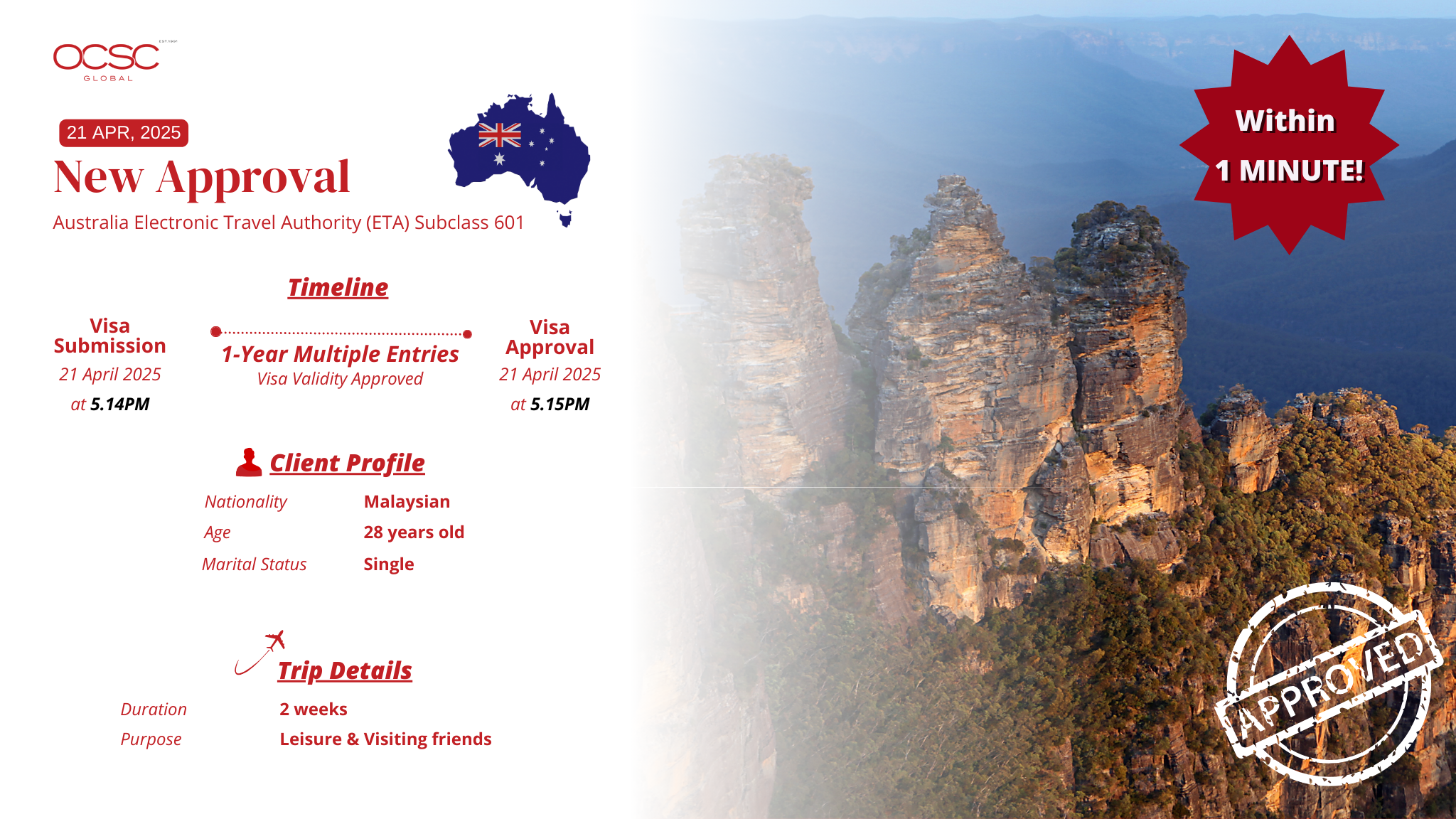 Talk about effortless travel! We’re thrilled to share that Ms. Tan, a Malaysian national, received her Australia Electronic Travel Authority (ETA) Subclass 601 approval in just 1 minute after submission—an incredible example of how seamless the visa process can be when you’re well-prepared.