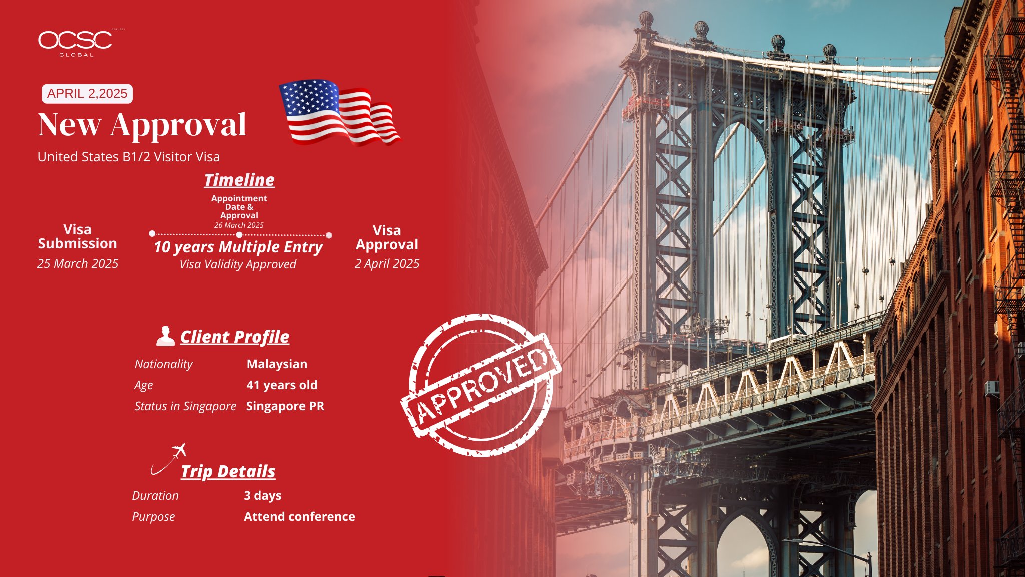 Securing a United States B1/B2 Visitor Visa can sometimes be a lengthy process, but with proper preparation, it can be fast and hassle-free. We’re excited to share that Leong, a Malaysian Singapore PR, successfully obtained his B1/B2 Visa in just one day after his appointment, allowing him to travel for an important business conference in the U.S.